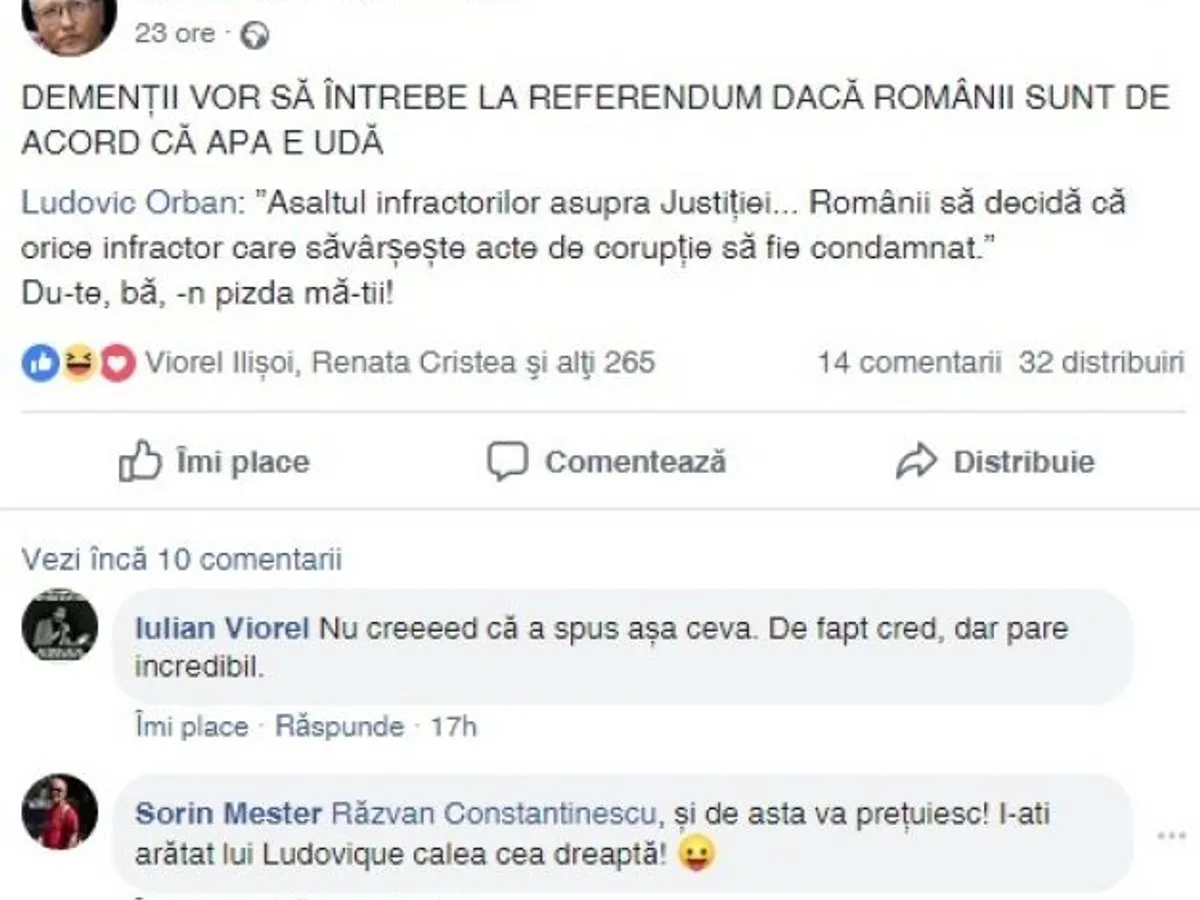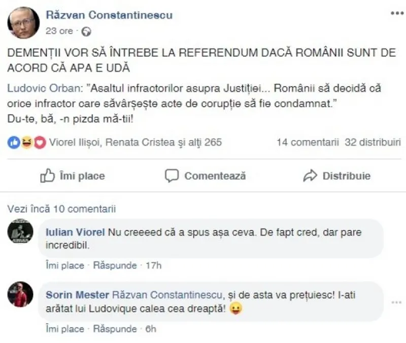 Într-o altă postare, Constantinescu îl înjură direct pe Ludovic Orban: „Du-te, bă, -n p..da mă-tii!”