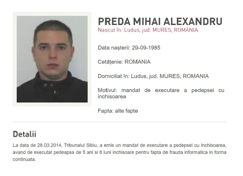 Preda este dat în urmărire și în România pentru executarea unei pedepse cu închisoarea de cinci ani și șase luni pentru fraude informatice continuate.