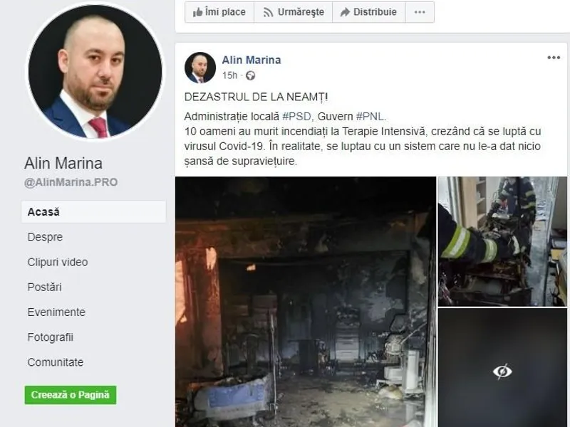 „DEZASTRUL DE LA NEAMȚ! Administrație locală #PSD, Guvern #PNL. 10 oameni au murit incendiați la Terapie Intensivă, crezând că se luptă cu virusul Covid-19. În realitate, se luptau cu un sistem care nu le-a dat nicio șansă de supraviețuire”, este mesajul care însoțește imaginile.