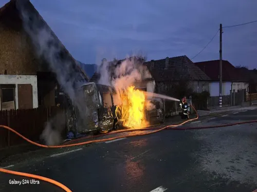 Unul dintre microbuze a luat foc şi a lovit ţeava de gaze a unui imobil, astfel că este pericol de explozie. Autorităţile au stabilit un perimetru de siguranţă, traficul pe DN 14 fiind oprit complet.
