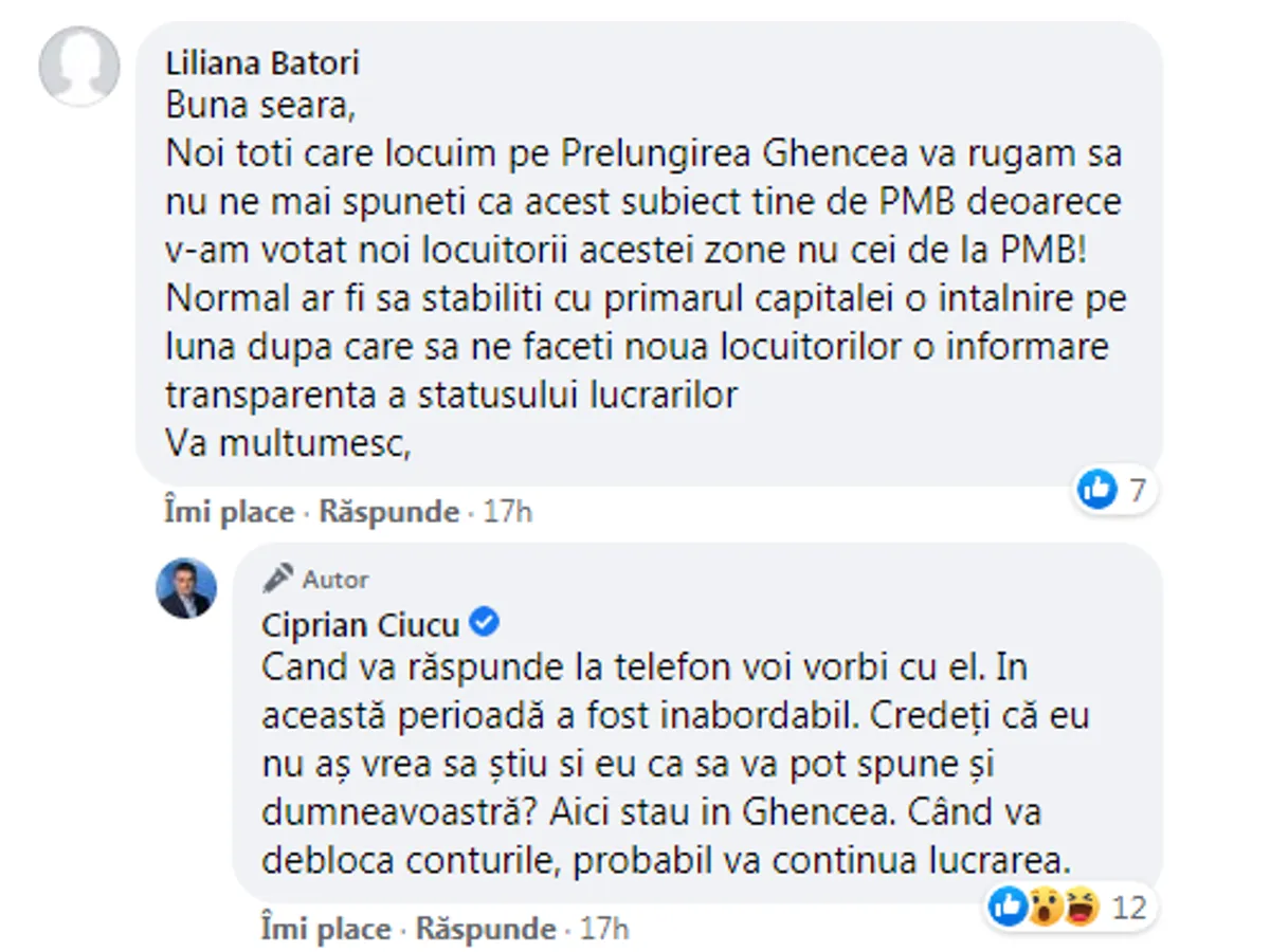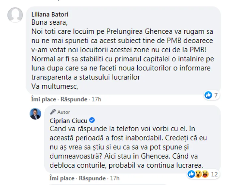 După ce o persoană care locuiește în sectorul 6 i-a scris într-un comentariu că ar trebui să existe întâlniri lunare între primarul de sector și primarul general pentru a rezolva probleme precum lucrările de la Prelungirea Ghencea, Ciprian Ciucu a răspuns că primarul general nu îi răspunde la telefon.