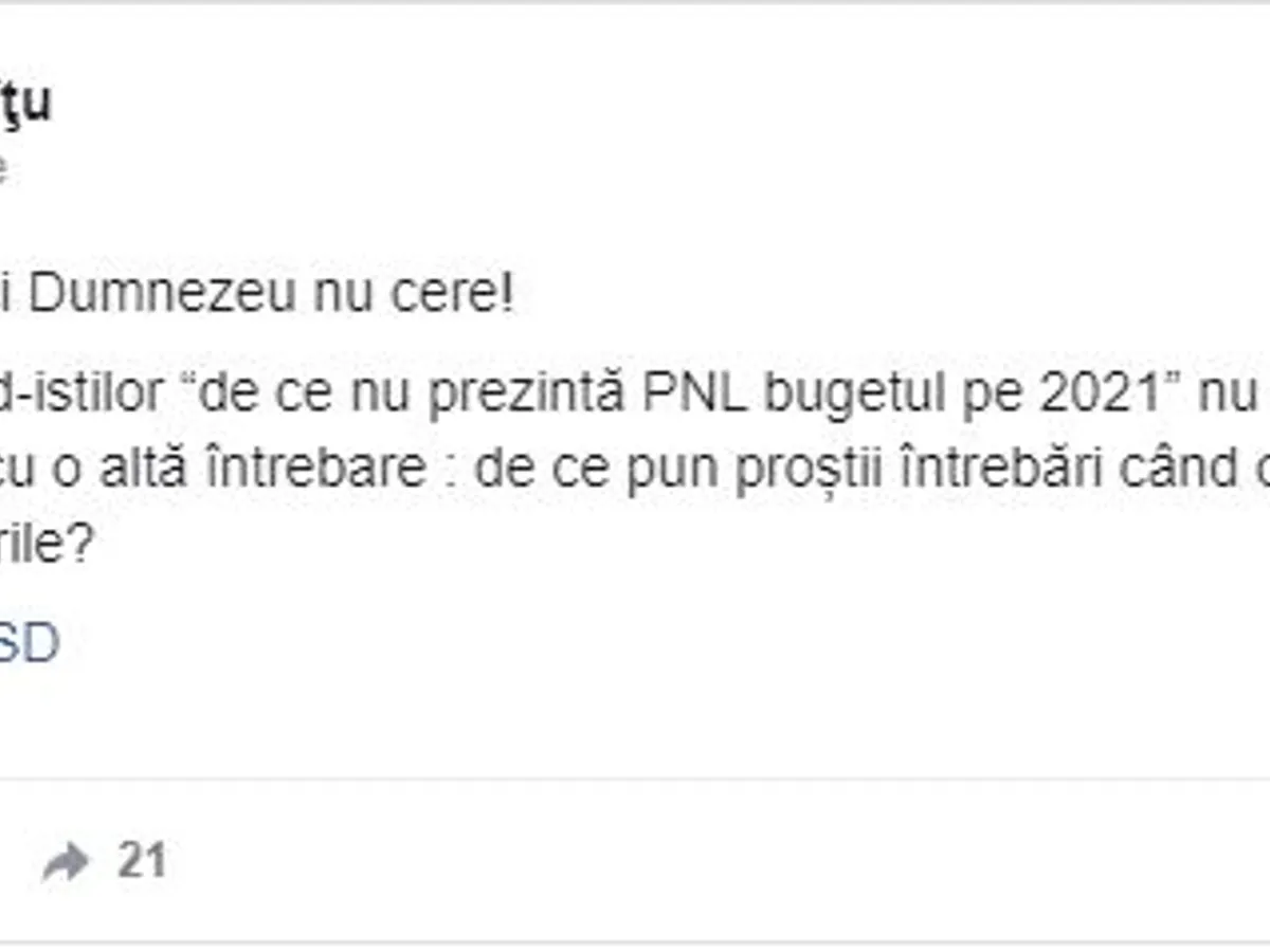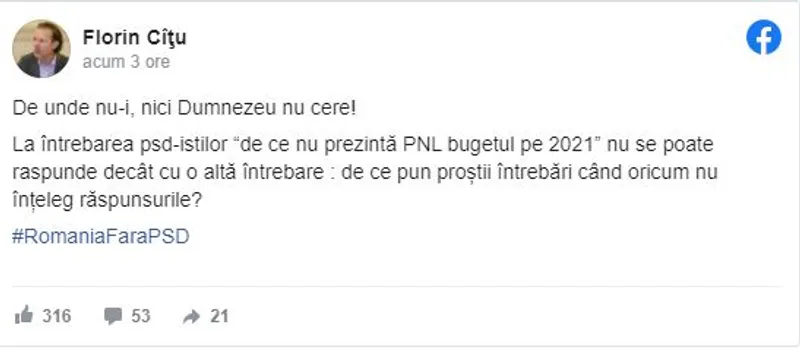 „La întrebarea psd-iștilor «de ce nu prezintă PNL bugetul pe 2021» nu se poate raspunde decât cu o altă întrebare: de ce pun proștii întrebări când oricum nu înțeleg răspunsurile?”, a scris Cîțu pe Facebook.