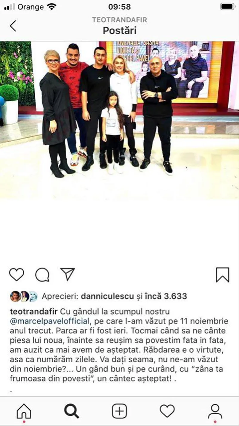 Într-o postare pe Instagram, Teo Trandafir scrie: „Cu gândul la scumpul nostru Marcel Pavel, pe care l-am văzut pe 11 noiembrie, anul trecut. (...) Tocmai când să ne cânte piesa lui nouă, am auzit că mai avem de așteptat (...)”.