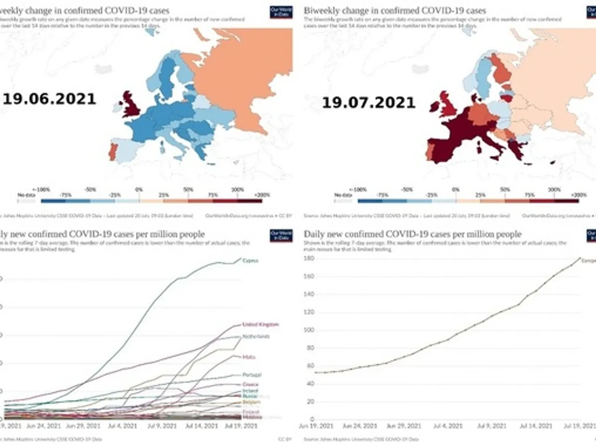 Creşterea cea mai mare este în Cipru, urmată de UK şi Olanda. În Europa a crescut incidenţa cazurilor de aprox. 3,4 ori în 19.07.2021, comparativ cu o lună în urmă.
