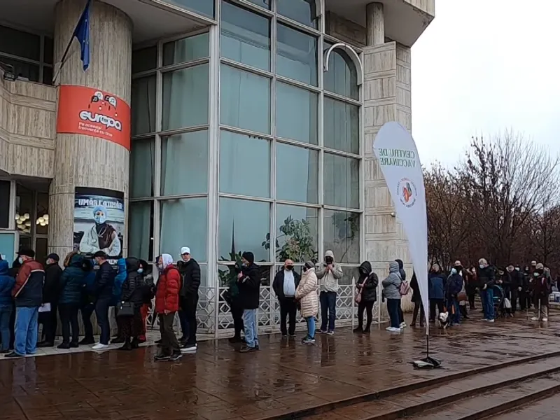 Aglomerație încă de la primele ore ale dimineții la un centru de vaccinare din Brăila. Oamenii nu s-au strâns pentru imunizarea anti-COVID, așa cum ar fi sperat autoritățile, ci pentru ridicarea voucherelor pentru vaccinați.