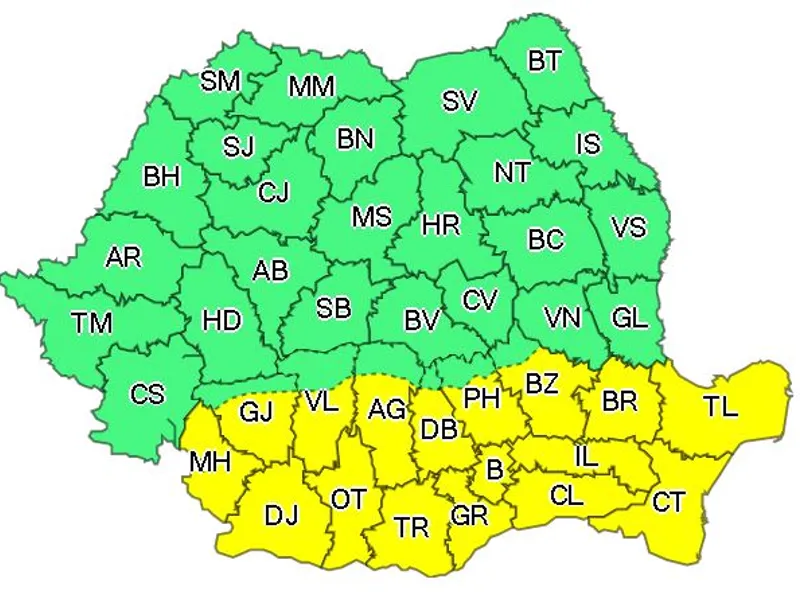 Judeţele vizate de primul Cod galben sunt: Argeş, Brăila, Buzău, Călăraşi, Constanţa, Dâmboviţa, Dolj, Gorj, Giurgiu, Ialomiţa, Mehedinţi, Olt, Prahova, Tulcea, Teleorman, Vâlcea şi Bucureşti.