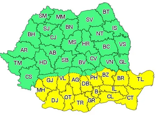 Codul galben de vreme instabilă vizează judeţele: Argeş, Bacău, Brăila, Botoşani, Braşov, Buzău, Călăraşi, Constanţa, Covasna, Dâmboviţa, Galaţi, Harghita, Ialomiţa, Iaşi, Neamţ, Prahova, Sibiu, Suceava, Tulcea, Vâlcea, Vrancea şi Vaslui.