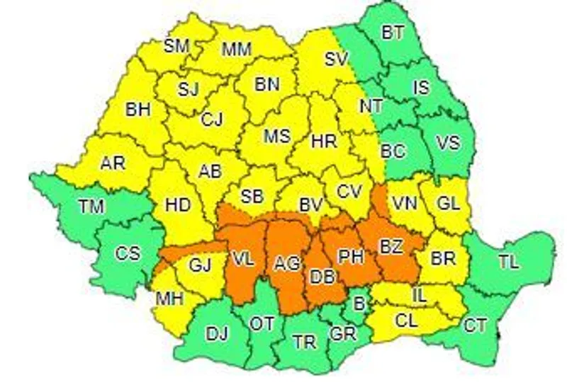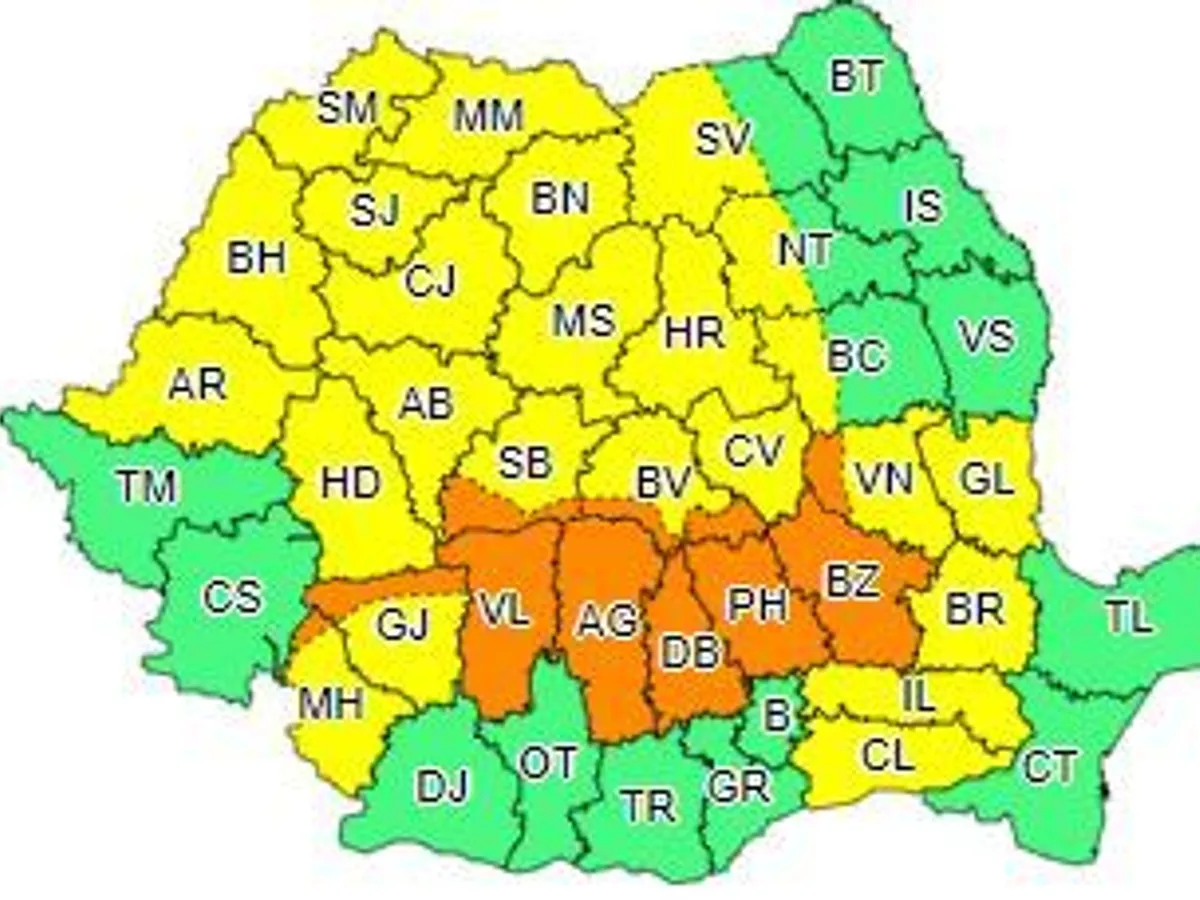În acelaşi interval, va fi Cod portocaliu de vijelii puternice, grindină, averse torenţiale în judeţele Vâlcea, Argeş, Dâmboviţa, Prahova, Buzău şi parţial în Vrancea, Braşov, Sibiu, Gorj şi Mehedinţi.