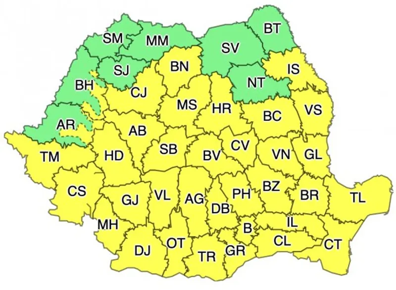 Judeţele aflate sub avertizare sunt: Alba, Argeş, Arad, Bacău, Bihor, Bistriţa-Năsăud, Brăila, Braşov, Buzău, Cluj, Călăraşi, Caraş-Severin, Constanţa, Covasna, Dâmboviţa, Dolj, Gorj, Galaţi, Giurgiu, Hunedoara, Harghita, Ialomiţa, Iaşi, Mehedinţi, Mureş, Olt, Prahova, Sibiu, Tulcea, Timiş, Teleorman, Vâlcea, Vrancea, Vaslui şi Municipiul Bucureşti.