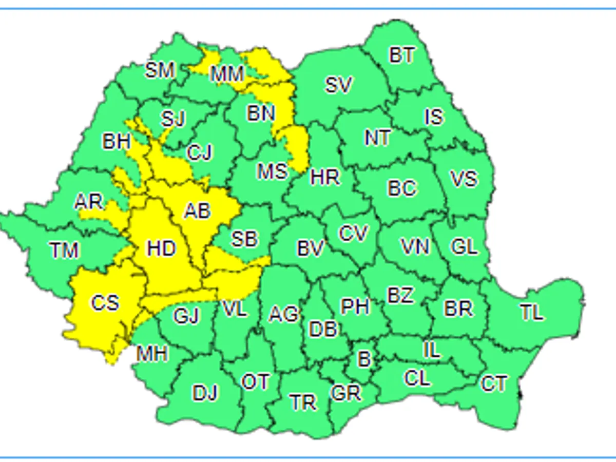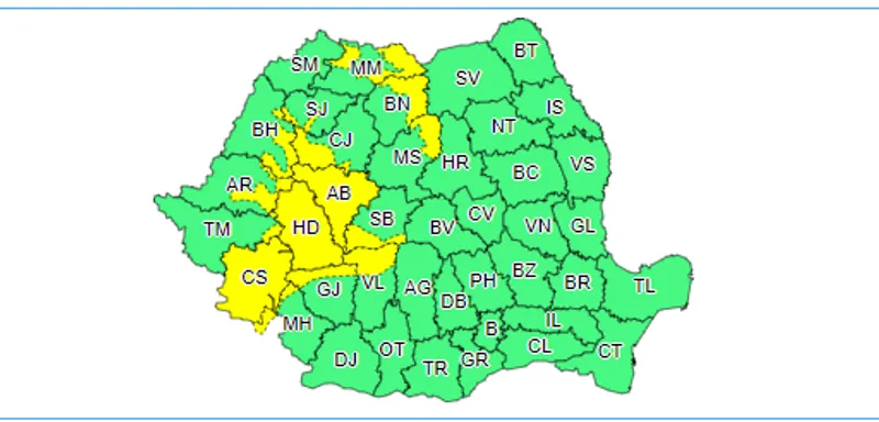 Codul galben va fi valabil în 15 judeţe.