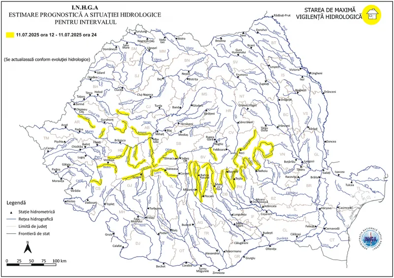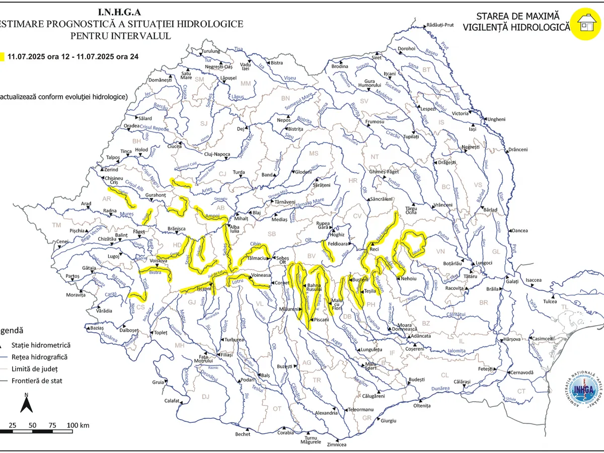 Conform Institutului Naţional de Hidrologie şi Gospodărire a Apelor (INHGA), până la ora 00:00, ca urmare a precipitaţiilor înregistrate, a celor prognozate şi a propagării, se pot produce scurgeri importante pe versanţi, torenţi, pâraie, viituri rapide, creşteri de debite şi de niveluri pe râurile din bazinele hidrografice: Jiu - afluenţii de stânga aferenţi sectorului aval S.H., Sadu - amonte S.H. Filiaşi (judeţul Gorj), Olt - afluenţii aferenţi sectorului aval de Acumularea Călimăneşti - amonte de Acumularea Slatina, şi Olteţ - bazin superior şi afluenţi bazin mijlociu şi inferior (judeţele: Vâlcea, Gorj, Argeş şi Olt).