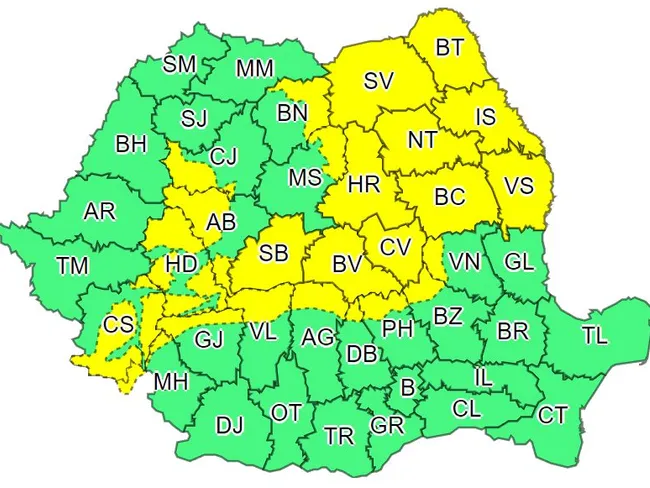 Judeţele avertizate total de meteorologi sunt: Suceava, Botoşani, Iaşi, Neamţ, Bacău, Vaslui, Covasna, Harghita, Braşov şi Sibiu, iar parţial: Alba, Argeş, Bistriţa-Năsăud, Buzău, Cluj, Caraş-Severin, Dâmboviţa, Gorj, Hunedoara, Mehedinţi, Mureş, Prahova, Vâlcea şi Vrancea.