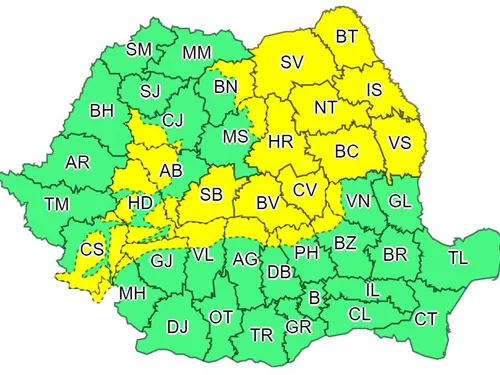 Administraţia Naţională de Meteorologie a emis luni o atenţionare Cod galben de ninsori însemnate cantitativ şi intensificări ale vântului în 24 de judeţe, care va intra în vigoare marţi dimineaţa şi va fi valabilă până miercuri seara.