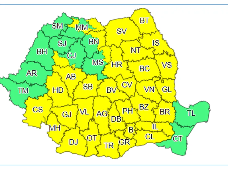 Meteorologii au emis, luni, o avertizare cod galben de ploi torenţiale, vijelii, descărcări electrice şi căderi de grindină, valabilă în cea mai mare parte a judeţelor ţării. Avertizarea este valabilă până la ora 23.00.