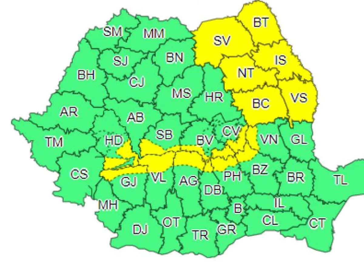 De asemenea, în intervalul vineri ora 22.00 - duminică ora 20.00, judeţele Suceava, Neamţ, Braşov, Covasna, Prahova, Dâmboviţa, Argeş, Vâlcea, Gorj, Sibiu, Hunedoara , Botoşani, Iaşi, Bacău, Vaslui, Vrancea şi Buzău se vor afla sub avertizare cod galben de ninsori însemnate cantitativ şi viscol.