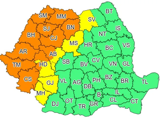Astfel, în intervalul 16 iulie, ora 10:00 - 17 iulie, ora 6:00, în judeţele Satu-Mare, Maramureş, Bistriţa-Năsăud, Sălaj, Cluj, Bihor, Arad, Timiş şi Caraş-Severin, precum şi în zona de munte a judeţelor Alba şi Hunedoara, este Cod portocaliu care vizează perioade cu instabilitate atmosferică deosebit de accentuată. Vor fi averse torenţiale, vijelii, grindină şi frecvente descărcări electrice.