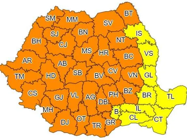 Administraţia Naţională de Meteorologie a emis o avertizare Cod portocaliu de precipitaţii, vijelie puternică şi grindină pentru 32 de judeţe, valabilă de vineri, ora 14:00, până sâmbătă, ora 6:00, precum şi o atenţionare Cod galben de instabilitate atmosferică temporar accentuată pentru toată ţara, valabilă de vineri, ora 12:00, până sâmbătă, ora 23:00.