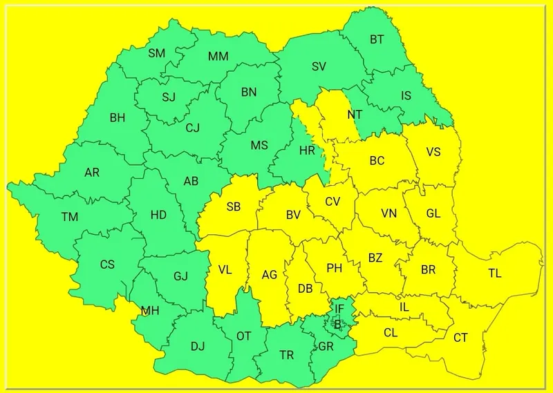 În intervalul menționat, în Dobrogea, jumătatea de sud a Moldovei, sudul Transilvaniei, nordul și estulMunteniei, nord-estul Olteniei, local în Carpații Orientali și Meridionali vor fi averse, descărcări electrice,intensificări de scurtă durată ale vântului (viteze în general de 50...60 km/h) și vijelii. Izolat vor fi căderi de grindină.