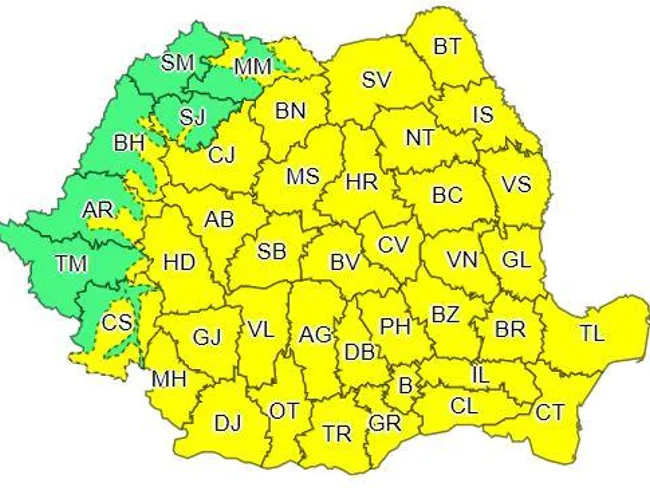 ”Local în regiunile vestice, nordice și centrale și pe arii mai restrânse în rest vor fi perioade cu instabilitate atmosferică ce se va manifesta prin averse, descărcări electrice și izolat grindină. Aversele vor putea avea și caracter torențial, iar izolat cantitățile de apă vor depăși 15...20 l/mp. Vântul se va intensifica în cea mai mare parte a țării și se vor înregistra la rafală viteze cuprinse, în general, între 45 și 55 km/h, iar la munte va sufla cu peste 70...80 km/h.”