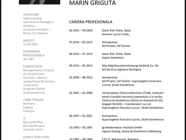 Acesta îl descrie pe Marin Griguţă ca fiind un expert în domeniul său - inginer, cu o experienţă de peste trei decenii în managementul lucrărilor de infrastructură feroviară, rutieră şi aeroportuară.
