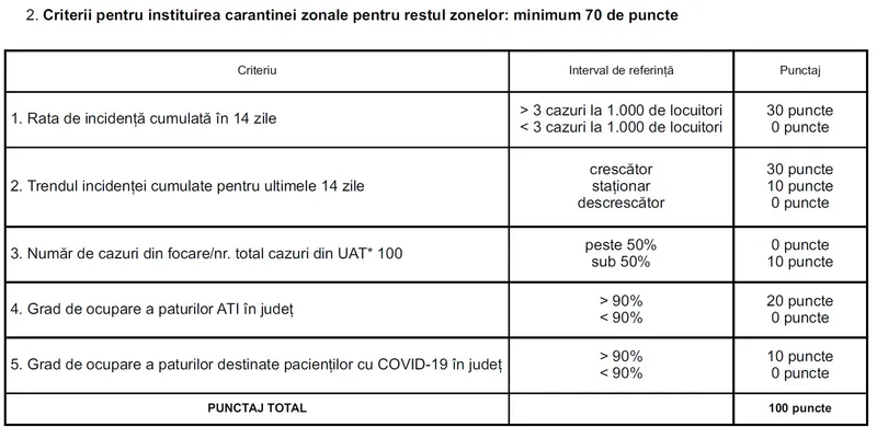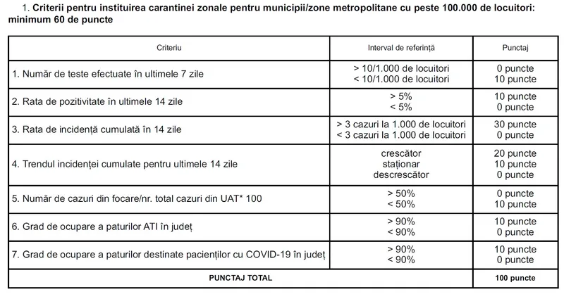 Astfel, criteriile pentru instituirea carantinei zonale pentru municipii/zone metropolitane cu peste 100.000 de locuitori sunt:
