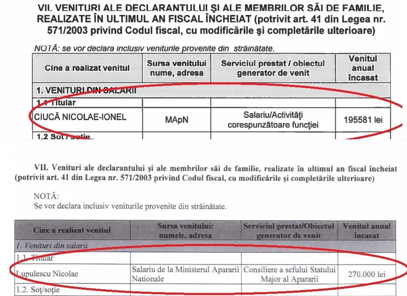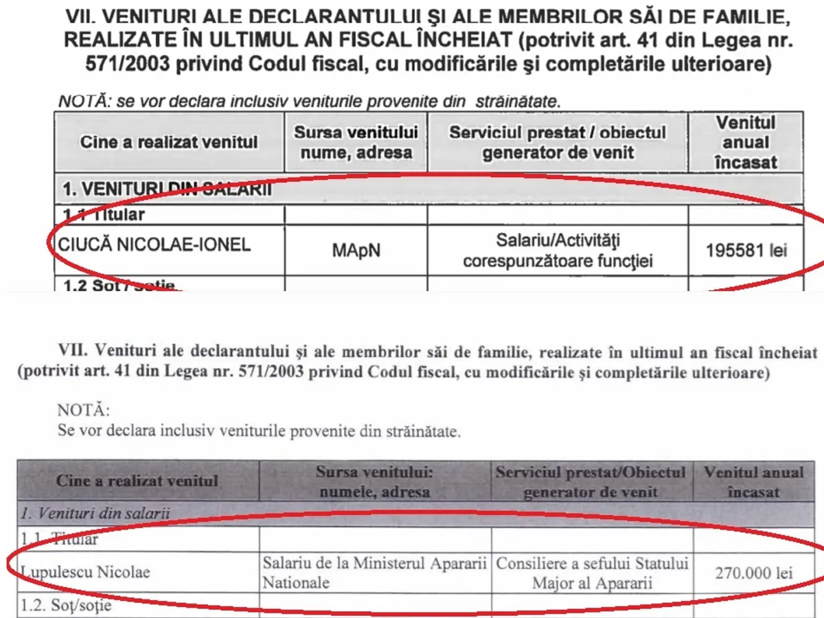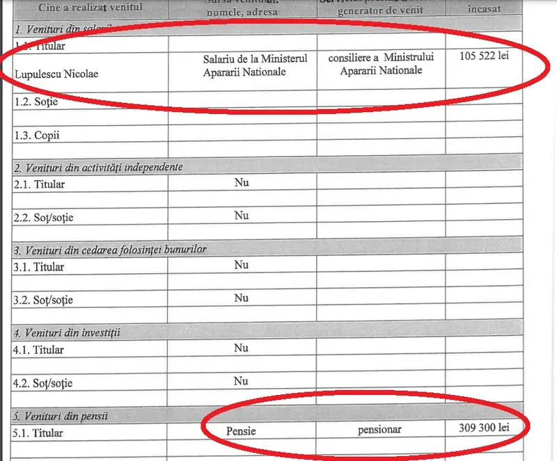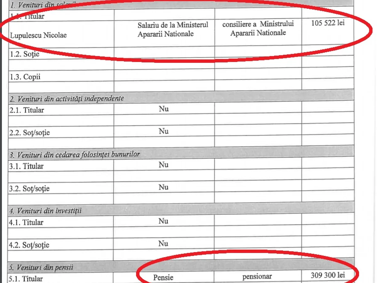Anul trecut, Lupulescu a încasat o pensie specială de 309.300 lei iar Ministerul Apărării i-a plătit în plus un salariu de 105.522 lei. Ceea ce înseamnă că pensia lunară a fost în jur de 5.300 euro, iar salariul, de 1.800 euro.