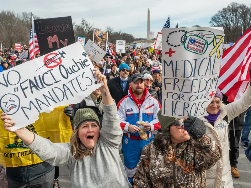 Festival de teorii ale conspirațiilor propagate în spațiul public în timpul unui protest organizat la Washington de antivacciniștii americani.