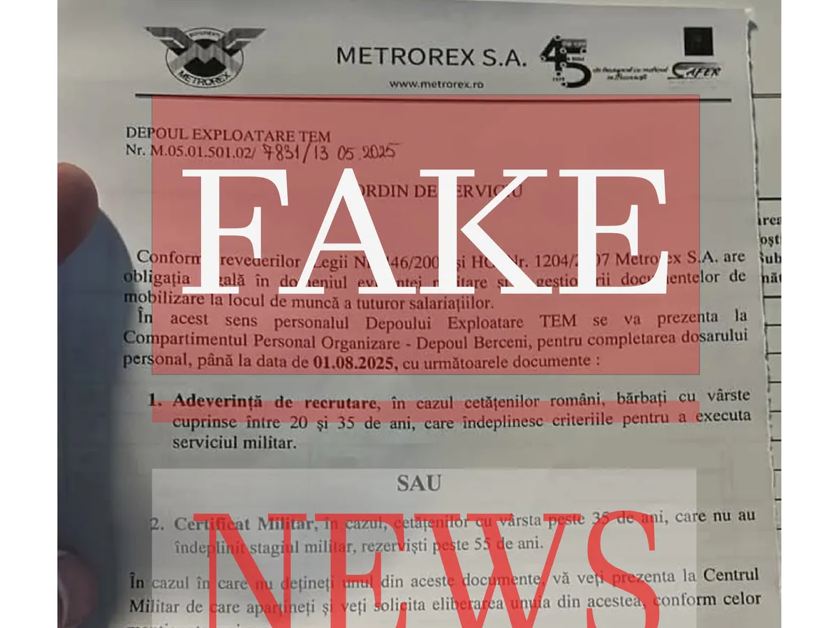 "Avertizam despre posibilitatea răspândirii de informaţii false pe acest subiect. Documentul administrativ folosit în această acțiune de dezinformare este emis de o structură a Metrorex S.A., pentru punerea în aplicare a procedurilor legale în ceea ce privește evidența salariaților cu obligații militare. Aceste proceduri au caracter de rutină, se desfășoară anual și nu au nicio legătură cu contextul de securitate generat de invazia Federației Ruse în Ucraina.