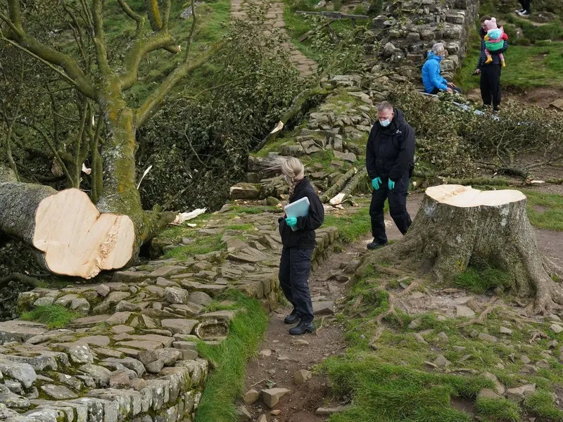 „Copacul lui Robin Hood” din UK, un arțar vechi de 300 ani aflat lângă Zidul lui Hadrian din nordul Angliei, a fost tăiat. Doi suspecți, un tânăr de 16 ani și un bărbat de peste 60 de ani, sunt achetați de poliție.