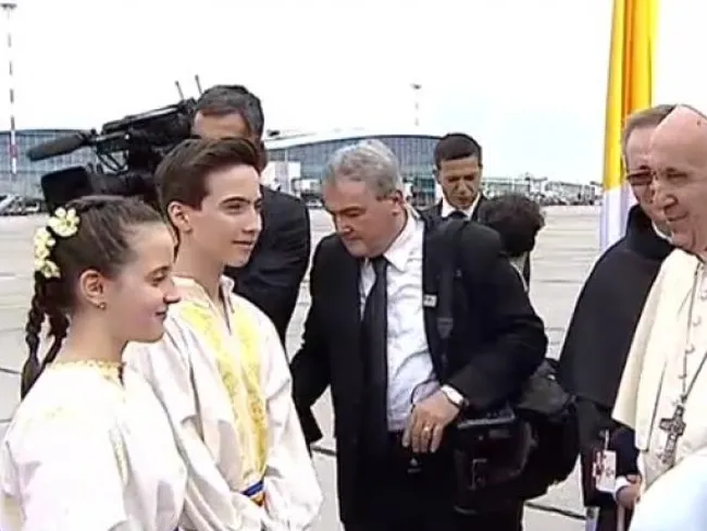 Cei doi copii care au oferit flori Sfântului Părinte sunt greco-catolici și au 13, respectiv, 12 ani. Ei sunt frate și soră și provin din familia unui erou al neamului românesc: Augustin Vișa, potrivit Administrației Prezidențiale.