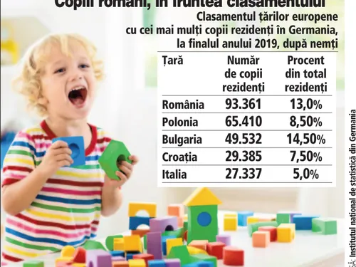 O statistică a Ziarului Financiar arată că numărul copiilor români, sub zece ani, rezidenți în Germania era, la finalul lui 2019, de 93.361, imediat sub germani și mult peste numărul copiilor polonezi.