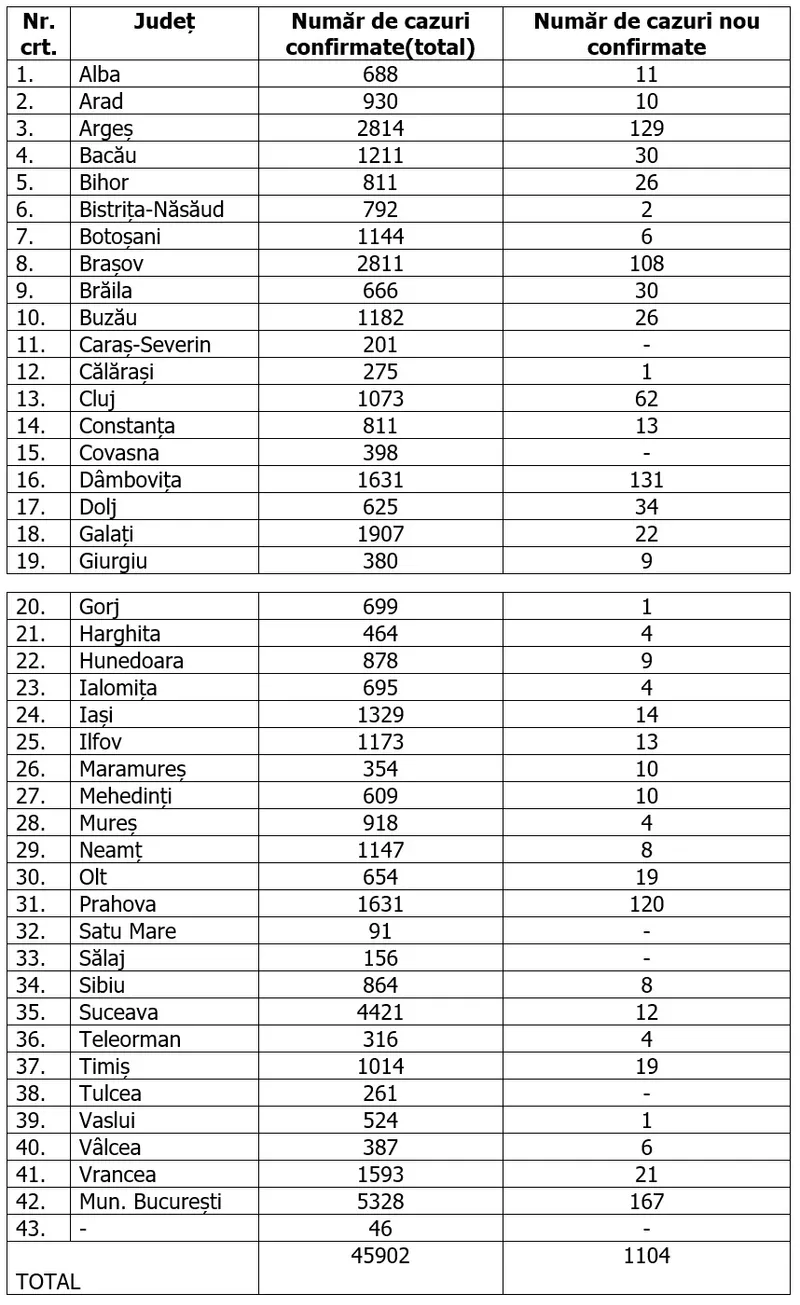 În total, în România au fost confirmate 45.902 de persoane infectate cu coronavirus, iar 2.206 persoane diagnosticate cu infecție cu COVID-19 au decedat.