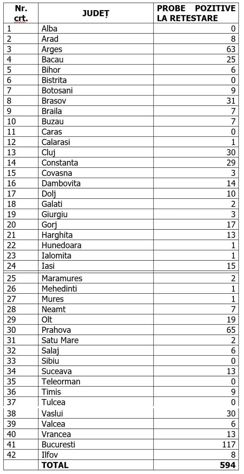 Distinct de cazurile nou confirmate, în urma retestării pacienților care erau deja pozitivi, 594 de persoane au fost reconfirmate pozitiv.