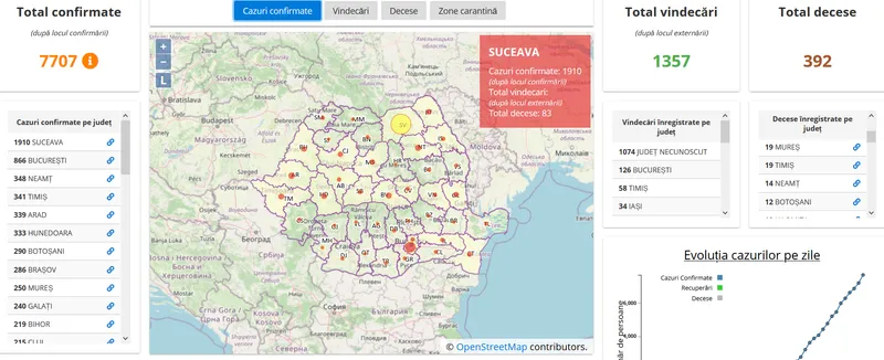 Județul Suceava are, joi, 1.910 cazuri confirmate de coronavirus și 83 de decese, cele mai mari numere din toate județele țării, potrivit datelor publicate de geo-spațial.org, pe baza informațiilor comunicate de autorități.