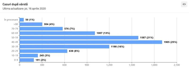 Cele mai multe cazuri s-au înregistrat, până în prezent, la grupa de vîrstă 40-49 de ani – 1905 cazuri, urmată de grupa de vârstă 50-59 de ani – 1.587 de cazuri și grupa 30-39 de ani – 1.198 de cazuri, potrivit analizei disponibile pe datelazi.ro.