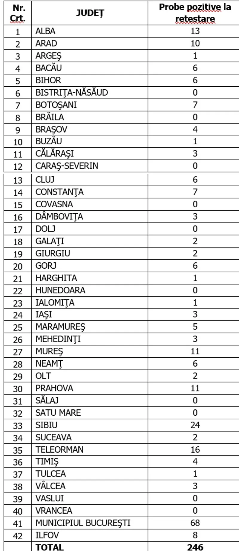 Distinct de cazurile nou confirmate, în urma retestării pacienților care erau deja pozitivi, 246 de persoane au fost reconfirmate pozitiv.
