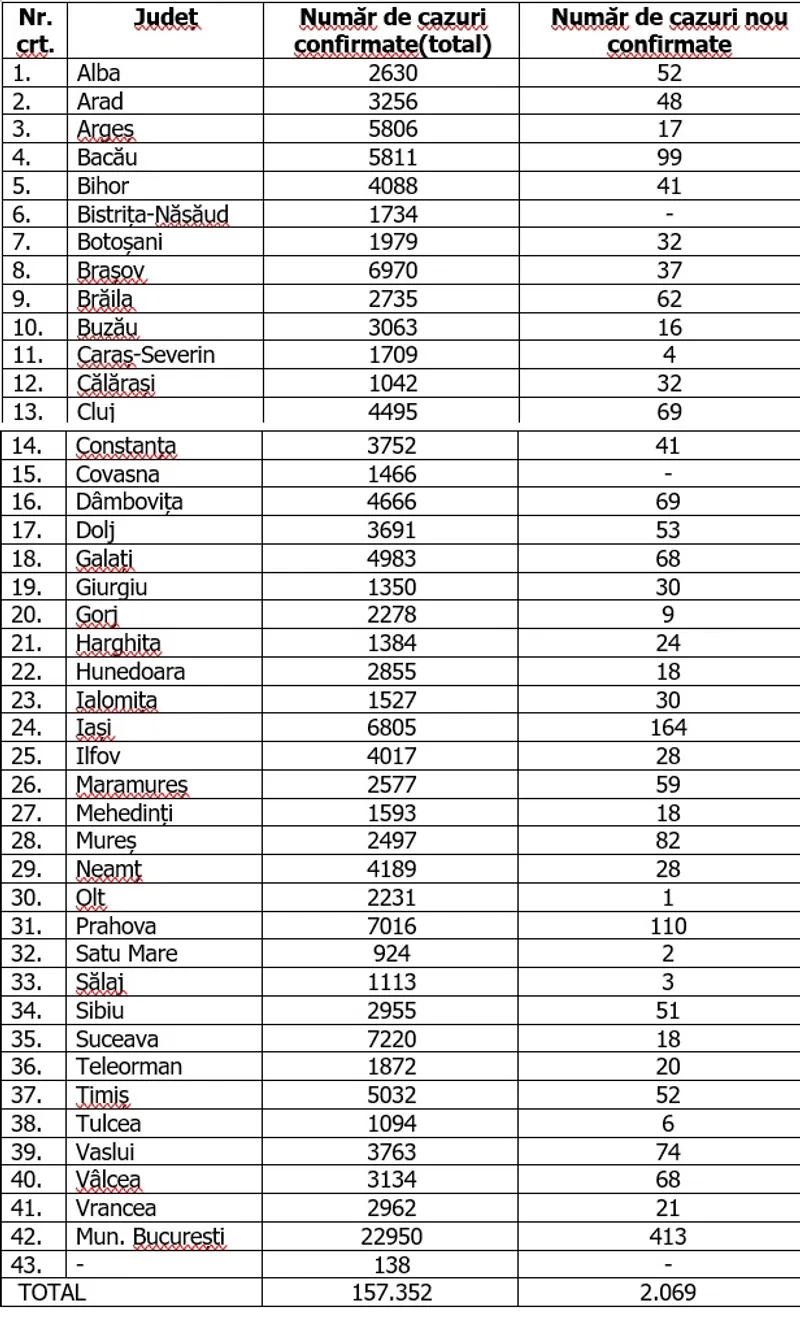 În urma testelor efectuate la nivel național, față de ultima raportare, au fost înregistrate 2.069 de cazuri noi de persoane infectate cu SARS – CoV - 2 (COVID – 19), acestea fiind cazuri care nu au mai avut anterior un test pozitiv.