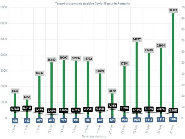 Se observă o scădere procentuală pe ultimele trei zile, până la 3,76%, la 25 iulie, ziua când s-a raportat un număr record de noi cazuri, 1.284, însă la un număr record de teste - 34.127.