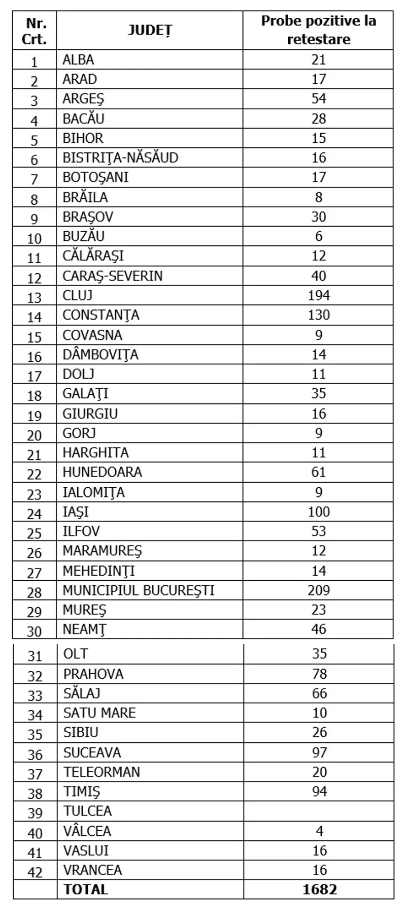 Distinct de cazurile nou confirmate, în urma retestării pacienților care erau deja pozitivi, 1.682 de persoane au fost reconfirmate pozitiv.