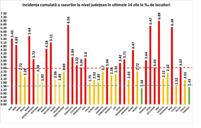 Coeficientul infectărilor cumulate la 14 zile, raportate la 1.000 de locuitori este calculat de către Direcțiile de Sănătate Publică, la nivelul Municipiului București și al județelor. Mai jos aveți graficul realizat în baza raportărilor primite de CNCCI de la Direcțiile de Sănătate Publică: