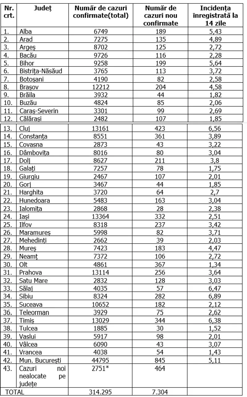 În total, în România au fost confirmate până în prezent 314.295 de cazuri de infectare cu coronavirus, iar 8.186 de oameni infectați au murit.
