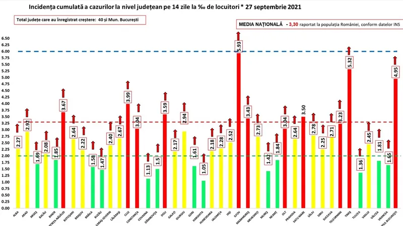 Coeficientul infectărilor cumulate la 14 zile, raportate la 1.000 de locuitori este calculat de către Direcțiile de Sănătate Publică, la nivelul Municipiului București și al județelor. Mai jos aveți graficul realizat în baza raportărilor primite de CNCCI de la Direcțiile de Sănătate Publică: