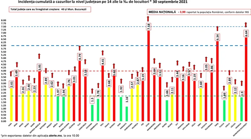 40 de județe și Capitala au înregistrat o creștere a incidenței în ultimele 24 de ore, iar media națională a incidenței a ajuns la 3,98 la mie.