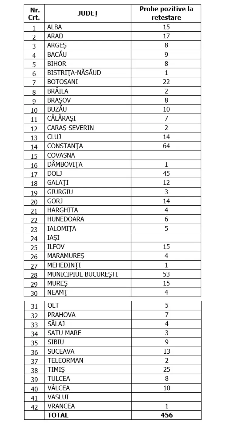 Distinct de cazurile nou confirmate, în urma retestării pacienților care erau deja pozitivi, 456 de persoane au fost reconfirmate pozitiv.