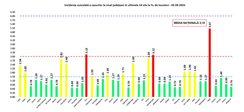 Trei județe din România sunt din nou în scenariul roșu, cu incidențe de peste 3 la mie: Timiș a sărit de 5 la mie - 5,07 la mie, Maramureș - 3,12 la mie și Cluj - 3,15 la mie.