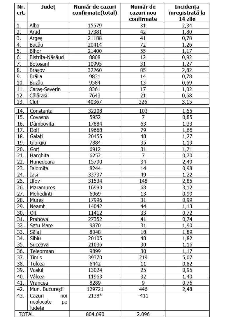 În total, în România au fost confirmate 804.090 de cazuri de infectare cu coronavirus, iar 20.403 de oameni cu COVID au murit.