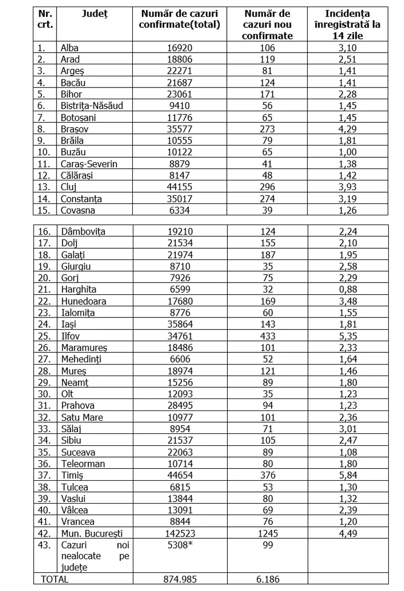 Miercuri, în toată țara, au fost raportate 6.186 de cazuri noi de infectare cu coronavirus. Cele mai multe cazuri au fost în:
