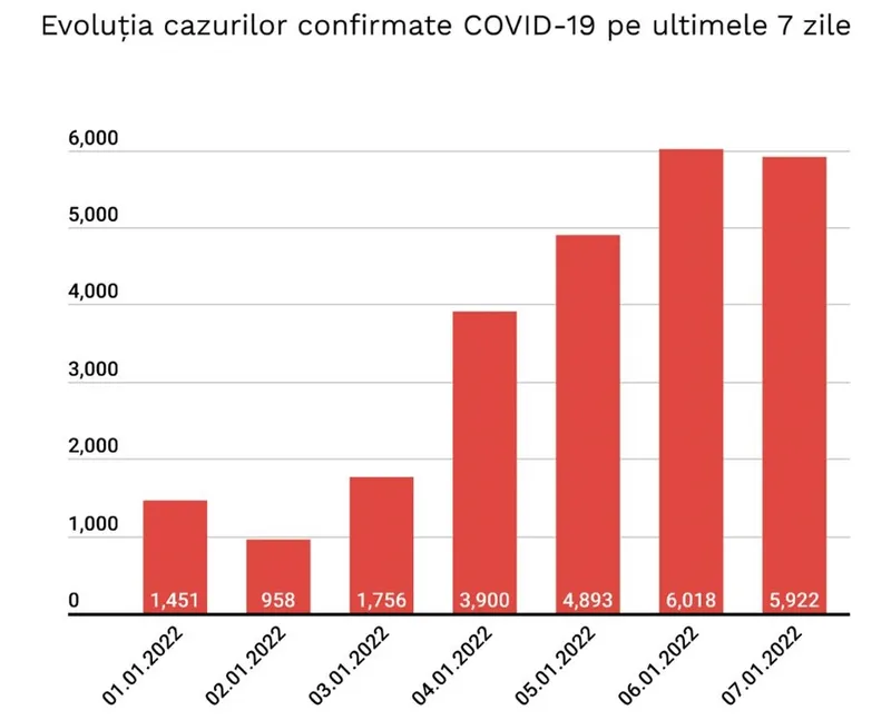 „În intervalul 06.01.2022 (10:00) – 07.01.2022 (10:00) au fost raportate de către INSP 31 de decese (19 bărbați și 12 femei), ale unor pacienți infectați cu noul coronavirus, internați în spitalele din Alba, Arad, Argeș, Bihor, Bistrița-Năsăud, Brăila, Buzău, Constanța, Dâmbovița, Dolj, Galați, Gorj, Hunedoara, Neamț, Prahova, Sălaj, Sibiu, Suceava, Timiș, Vâlcea, Vrancea și Municipiul București.
