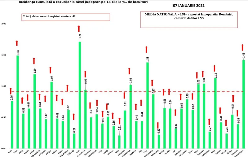 42 de județe raportează incidență COVID în creștere. Capitala - 1,42 la mie. Vârful - Cluj, cu 1,71 la mie