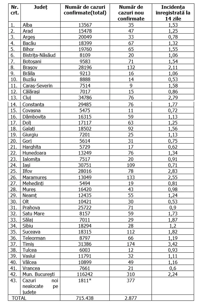 În total, în România au fost confirmate 715.438 de cazuri de infectare cu coronavirus, iar 17.938 de oameni infectați au murit.